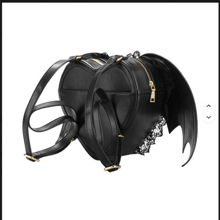 Transform your outfit with this gothic bat-wing backpack — a bold fusion of fantasy and fashion. Crafted from sleek black faux leather, this unique bag features dramatic sculpted bat wings, a subtle bat-shaped body, and piercing golden stud eyes for a hauntingly stylish look. Finished with a delicate black lace trim for a hint of dark romance.
