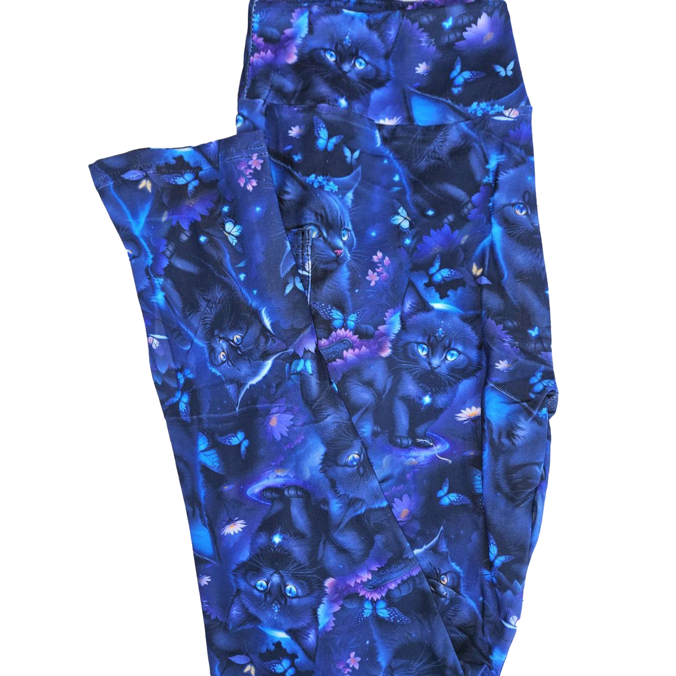 Embrace a touch of magic with this enchanting pattern featuring adorable black kittens set against a deep, dreamy blue and purple background. The design is rich in whimsical detail, with blue eye black kittens playfully nestled among soft florals and twinkling lights. Scattered throughout are fluttering butterflies in shades of blue and violet, adding to the mystical, night-sky ambiance.