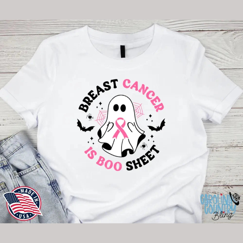 Show your support with a spooky twist! This playful "Breast Cancer Is Boo Sheet" T-shirt blends Halloween spirit with breast cancer awareness in a bold, empowering way. Featuring a cute ghost rocking a pink ribbon and surrounded by bats, spiders, and a cheeky pun, it’s the perfect shirt to wear during October—aka Breast Cancer Awareness Month and Halloween season.