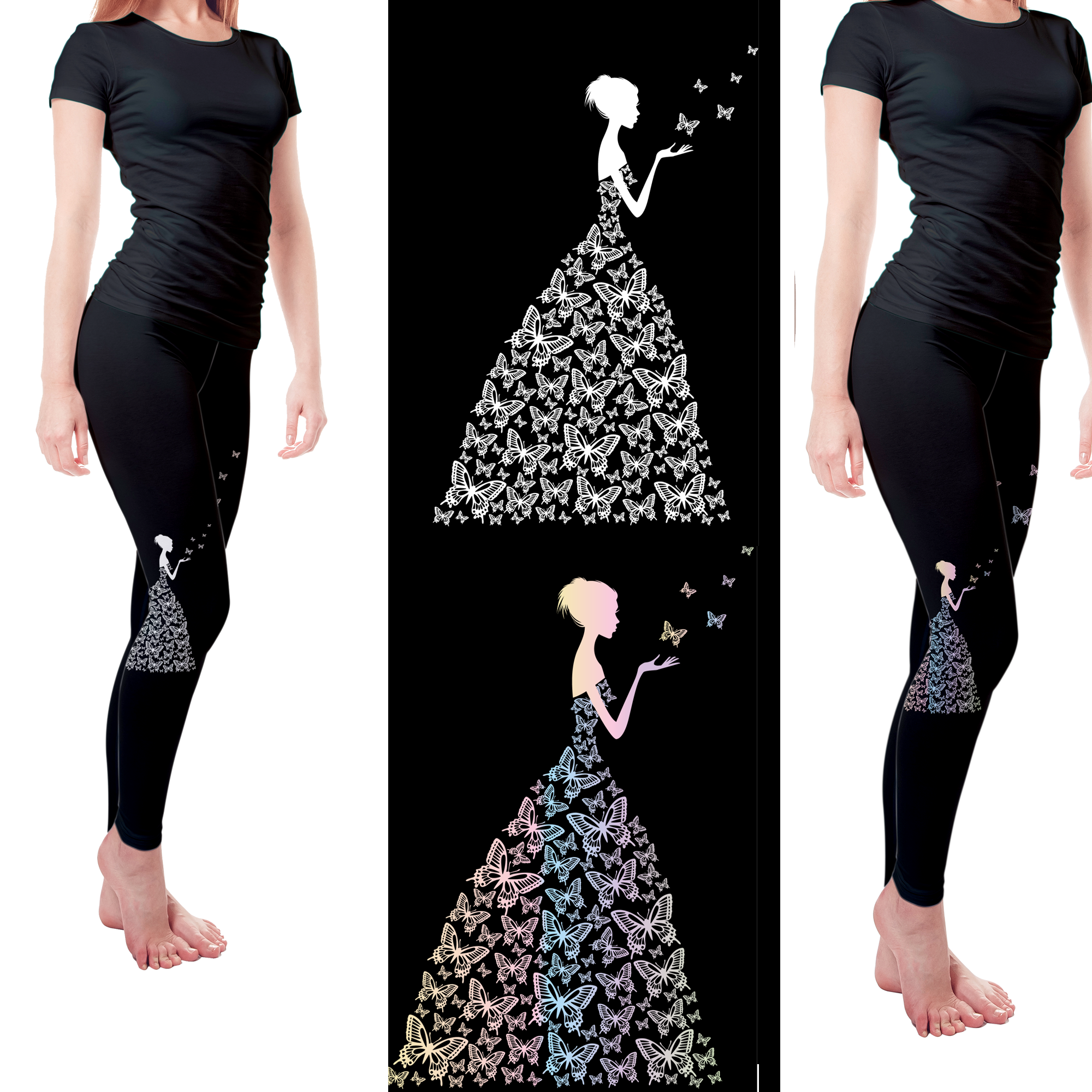 Step into elegance with these beautifully designed leggings, featuring an artistic silhouette of a woman whose flowing gown is made entirely of delicate butterflies. Whether you prefer classic monochrome or a soft pastel gradient, these leggings bring a sense of grace and movement to your wardrobe.
