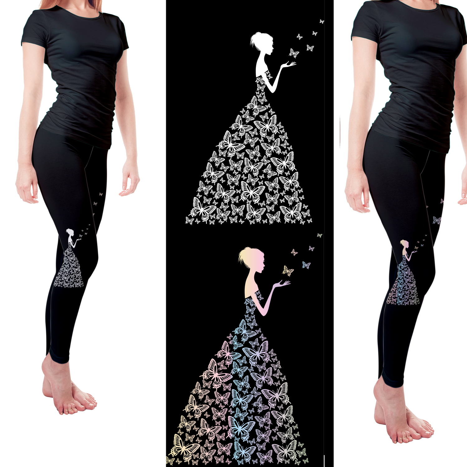Step into elegance with these beautifully designed leggings, featuring an artistic silhouette of a woman whose flowing gown is made entirely of delicate butterflies. Whether you prefer classic monochrome or a soft pastel gradient, these leggings bring a sense of grace and movement to your wardrobe.