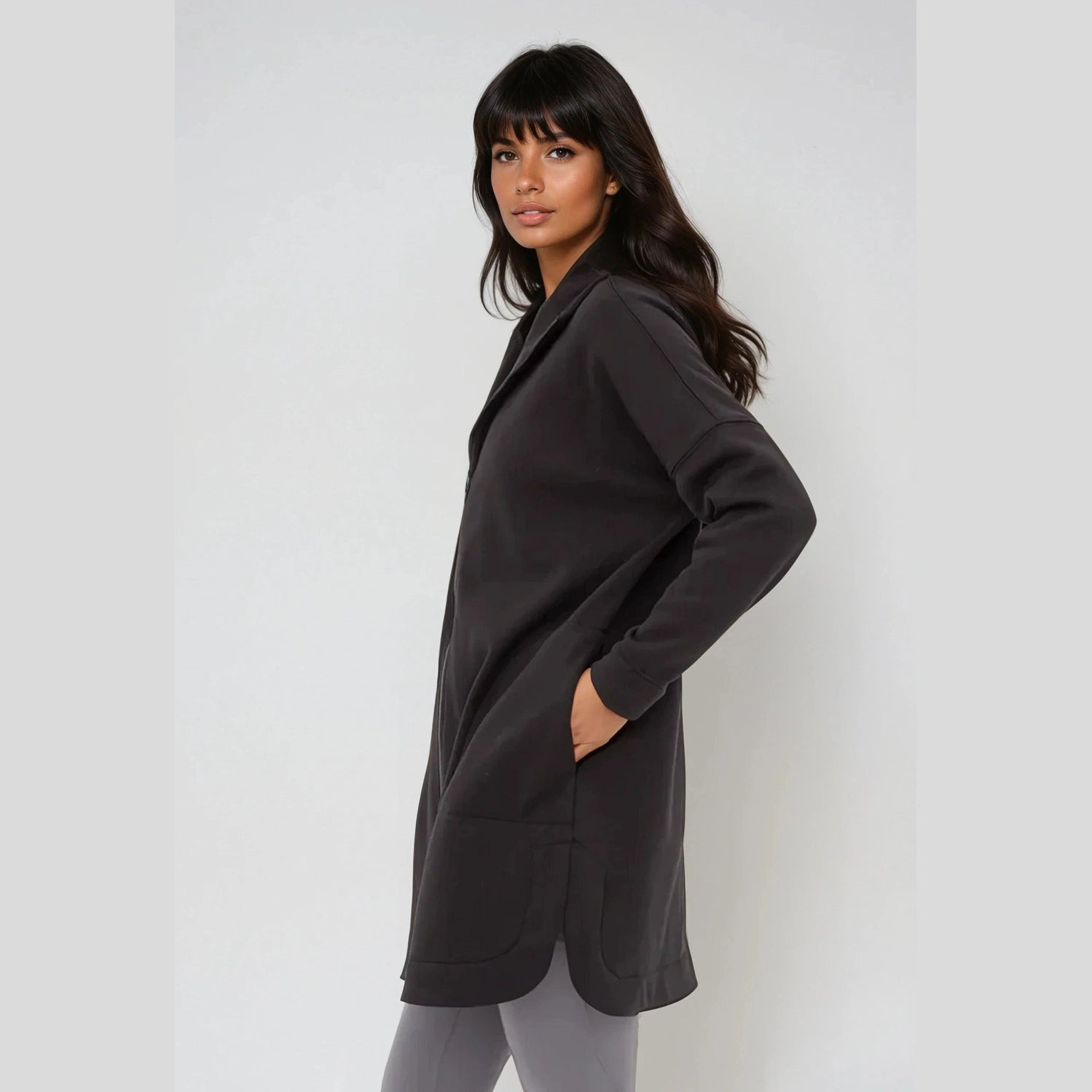 Experience ultimate comfort with our new Cozy Comfort Zip Up Hoodie Jacket. Made with a soft, mid-weight fleece (68.5% polyester, 28.5% cotton, 3% spandex), this longline jacket falls to mid-thigh length for extra coverage and warmth. The unique curved hemline with notched sides adds a stylish touch while the side pockets feature curvilinear stitching for added detail. Whether you're lounging at home or running errands, stay cozy and fashionable in our must-have hoodie jacket. This jacket is easy to care for and machine washable.