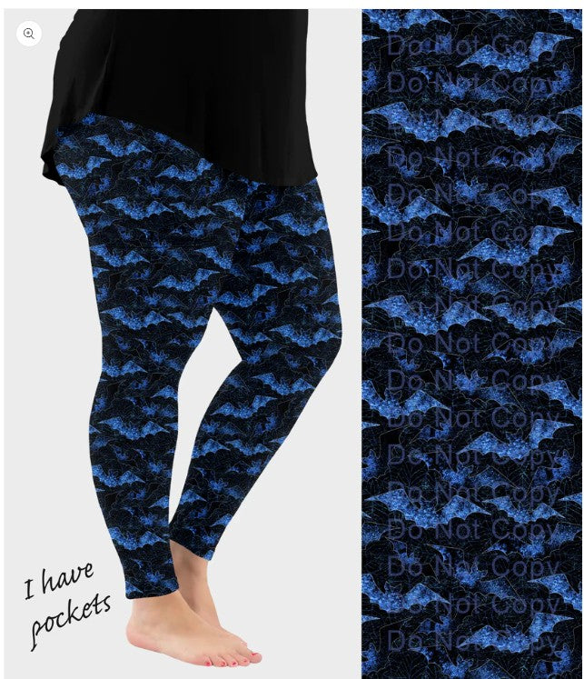 Embrace your dark side in style with the Midnight Bat Flight Pocket Leggings. Featuring a mesmerizing pattern of blue bats soaring across a black night-sky background, these leggings bring gothic elegance and mysterious charm to your everyday look. The intricate bat design glows with shades of cobalt and electric blue, making these leggings a perfect statement piece for Halloween season or year-round dark fashion lovers.