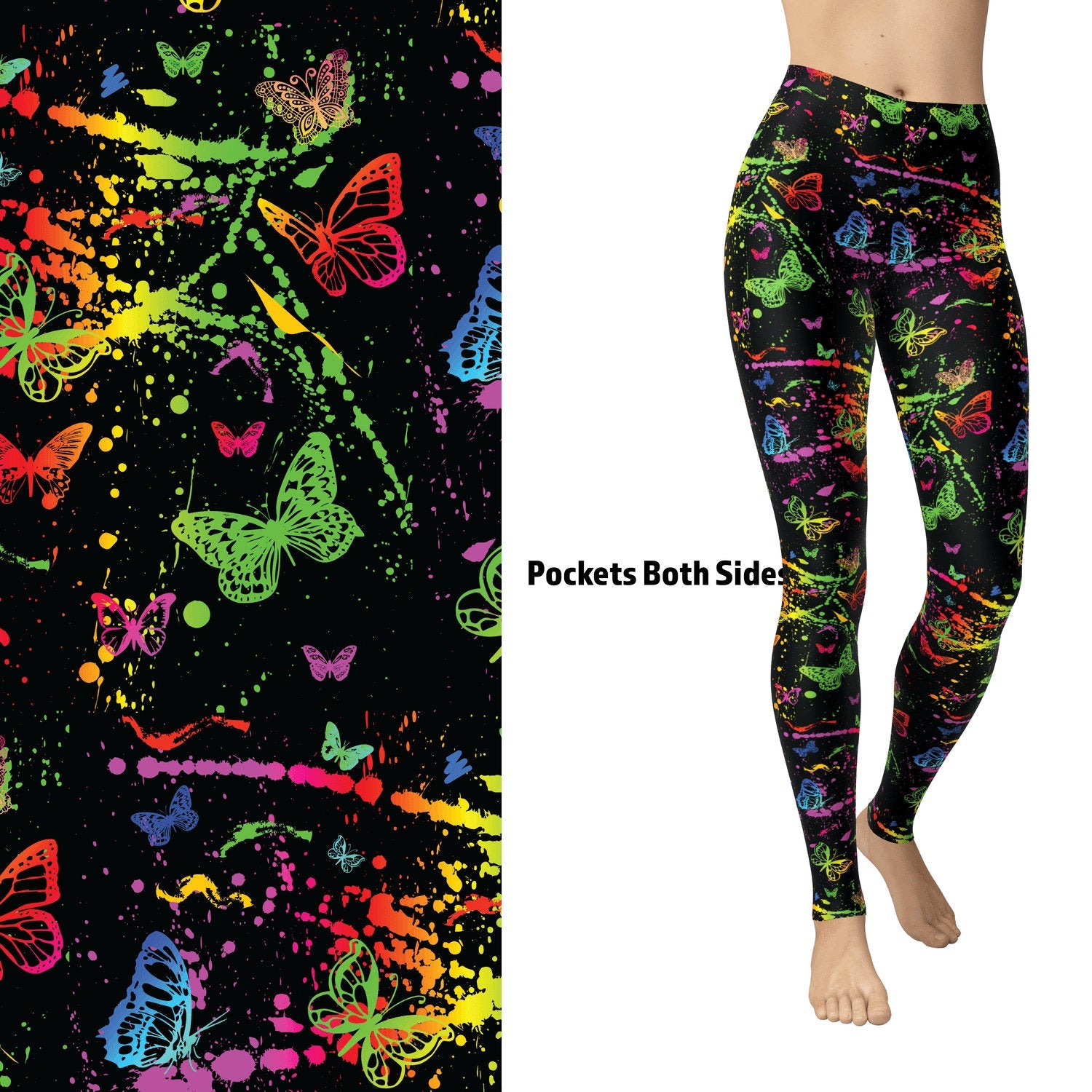 Step into a burst of color with these neon rainbow butterfly leggings. Set against a sleek black background, the vivid butterflies and electric paint splatters create an energetic, artistic look that turns every workout or outing into a statement.