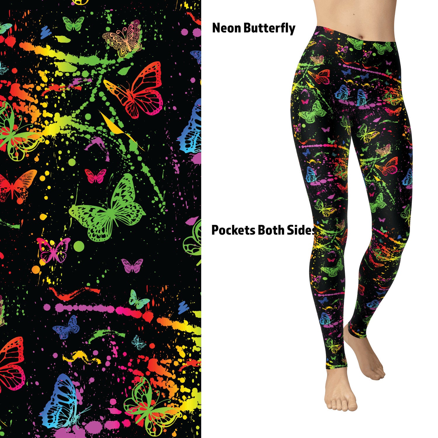 The leggings on the right feature a bold and vibrant design with neon-colored butterflies and splashes of paint on a black background. The pattern is lively and dynamic, with multicolored butterflies in shades of green, orange, pink, purple, yellow, and blue scattered throughout, complemented by matching neon splatter effects.