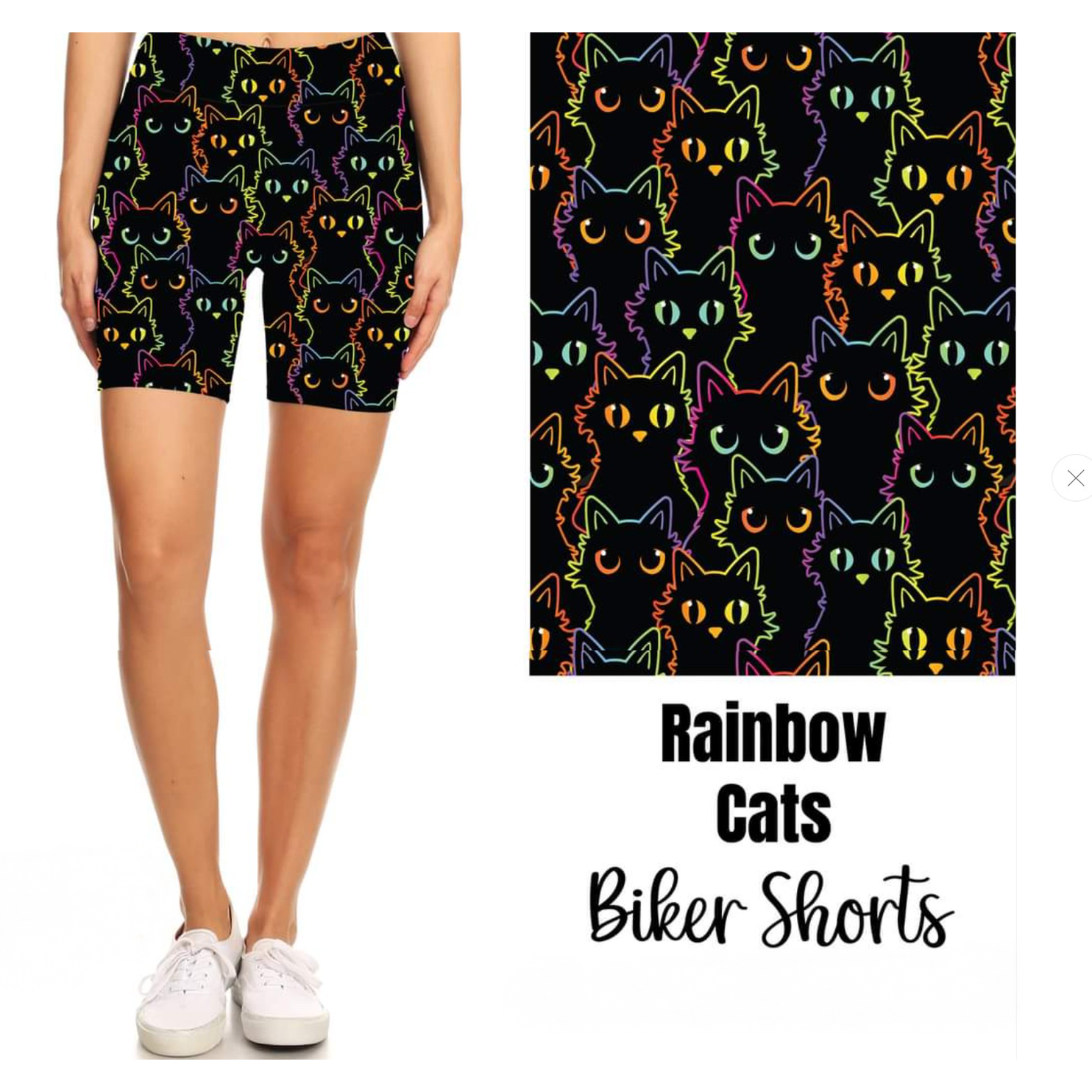 Add a playful pop of color to your activewear collection with these Rainbow Cats Biker Shorts! Featuring a fun and vibrant all-over pattern of cat silhouettes outlined in neon rainbow hues—like orange, green, purple, pink, and blue—these shorts are a must-have for cat lovers with bold style. Each kitty is accented with expressive, brightly colored eyes that stand out against the sleek black background, creating a fun and eye-catching contrast.
